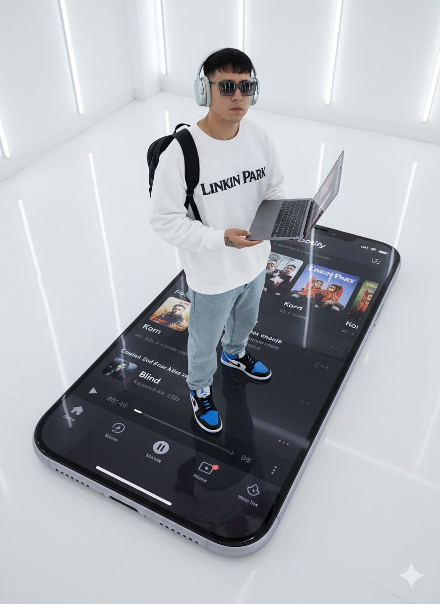 Crea una foto elegante a partir de la imagen, el es modelo joven , manteniendo su corte de pelo ,de pie en una pantalla gigante del iPhone 16 pro max que muestra una lista de reproducción de Spotify tocando la canción de Korn Blind . Lleva una mochila negra, AirPods Max 2025, un jean estilo mom,una sudadera de gran tamaño con un estampado 'Linkin Park ' y unos zapatos air jordan de corte alto, también sostiene un portátil Mac en su mano izquierda. El ángulo de arriba hacia abajo resalta la escala del teléfono, el ambiente es elegante, moderno y minimalista